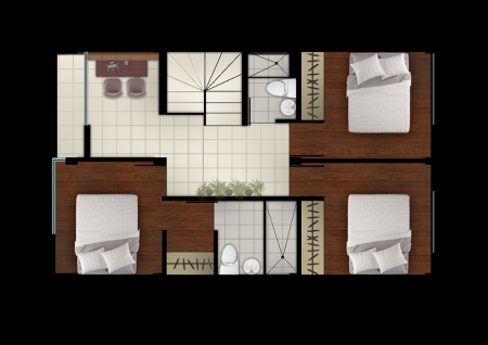 Planta Alta: tres dormitorios, uno de ellos máster con su baño propio, y los dos restantes con un baño completo compartido. Todos los dormitorios poseen amplios y espaciosos closets de melamínico, con piso flotante de procedencia alemana.