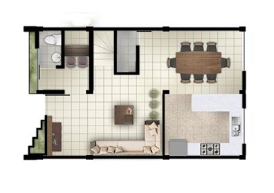 Planta Baja: sala, cocina, comedor, bar, baño social, bodega y patio posterior de 18 metros cuadrados, con pisos de cerámica de primera calidad. La cocina cuenta con mesón de granito, hermosos y funcionales muebles superiores e inferiores de melamínico.